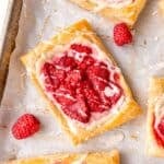 Spread about 1 tablespoon of cream cheese mixture over the inner rectangle of each pastry. Top it with a single layer of raspberries.